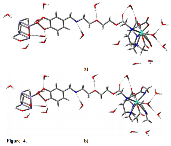 The interaction between solvent (water) and solute (complex) significantly influences the results, that way, this is a central concern in computational chemistry simulations. Thus, the calculations suggest that the use of implicit solvent did not influence the results, showing that the solvation sphere was adequate. Therefore, the proposed hybrid compound may be a promising contrast agent for MRI.