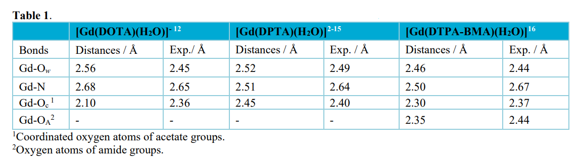 From the results of Tab. 1, it is possible to observe that our calculations were able to reproduce reasonably well the distances between the GdIII and the ligand, observed with the experimental results performed by x-ray.