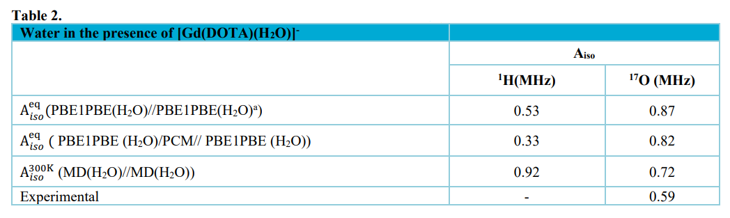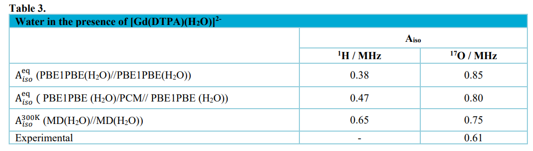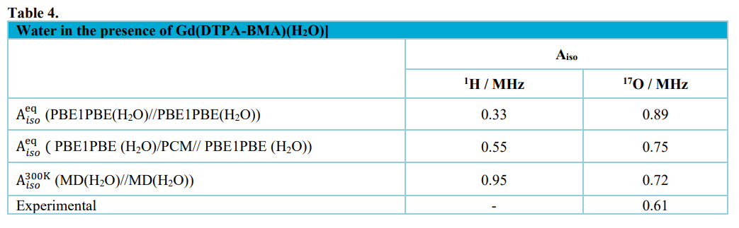Analysing now the complex [Gd(DTPA)(H2O)]2- , in Tab. 3, the Aiso values of equilibrium structure, A𝑖𝑠𝑜eq (PBE1PBE(H2O)//PBE1PBE(H2O)), was of 0.38 MHz for the 1H and 0.85 MHz for the 17O. The calculations with the implicit solvent and explicit A𝑖𝑠𝑜eq (PBE1PBE (H2O)/PCM// PBE1PBE (H2O)), the values obtained were of 0.47 MHz for the 1H and 0.80 MHz for the 17O, it was observed that the values of the explicit and implicit solvent next are the values only with explicit solvent, in other words, the water molecules placed as solvent were able to realistically represent our system. The calculations with uncorrelated structures of the MD, A𝑖𝑠𝑜300K (MD(H2O)//MD(H2O)), we have the values of 0.65 MHz for the 1H and 0.75 for the 17O. Thus, the thermal effects were also shown to be important. In fact, the molecular dynamics calculations are important to simulate a more real system, thus, it is expected that the results are closer to the experimental ones.
