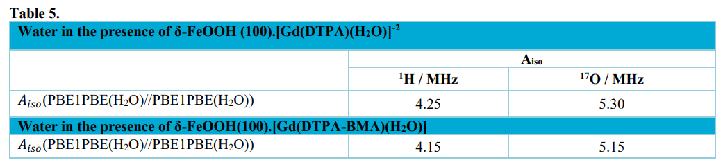 As already mentioned, thermal effects are important. However, for our proposal of a new contrast agent this effect was neglected, in fact despite the importance of this effect, our objective is to verify if the hybrid compound can be used as CA. In this way, to reduce the computational cost, we perform calculations only with the balance structure. Thus, it was made Aiso calculations only with the lowest energy conformer of hybrids (δ-FeOOH(100).[Gd(DTPA)(H2O)]2-, δ-FeOOH(100).[Gd(DTPA-BMA)(H2O)]). The values of Aiso for the hybrid compounds (Tab. 5) show that both significantly increase. For the first hybrids δ-FeOOH(100).[Gd(DTPA)(H2O)]2- values of 4.25 MHz and 5.30 MHz were obtained for the 1H e 17O atoms, respectively. For the hybrid δ-FeOOH(100).[Gd(DTPA-BMA)(H2O)] the values of Aiso were found to be 4.15 MHz and 5.15 MHz, respectively. Thus, it is noted that the hybrid compounds can be promising contrast agents for MRI since they showed a significant increase in the values of Aiso. Figure 4 shows the structures of hybrid compounds.