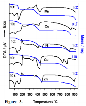 Carbonates of Mn(II), Co(II), Ni(II), Cu(II) and Zn(II) were prepared by adding slowly, with continuous stirring, a saturated sodium hydrogen carbonate solution to aqueous solutions metal chloride, until total precipitation of the metal ions. The precipitates were washed with distilled water until the elimination of chloride ions (qualitative test with AgNO3/HNO3 solution for chloride) and was placed in vacuum desiccator until constant mass.