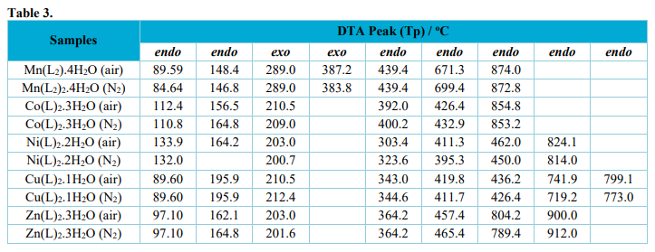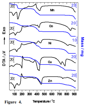 By the TG/DTA curves it was possible to establish the stoichiometry of the compounds, such as: ML2.xH2O, where M represents the metallic ions M = Mn2+, Co2+, Ni2+, Cu2+ and Zn2+; L represents the anion NH2SO3- and x the number of water molecules ranging from 1 to 4, where x = 4 for Mn2+, 3 for Co2+ and Zn2+, 2 for Ni2+ and 1 for Cu2+. In a synthetic air atmosphere, the events associated with the thermal decomposition of the ligand occur at slightly lower temperatures than in a nitrogen atmosphere. Tables 2 and 3 show the results extracted from the TG and DTA curves in the atmosphere of synthetic air and nitrogen. Figures 3 and 4 show the TG and DTA curves in the atmosphere of synthetic air and nitrogen, respectively.
