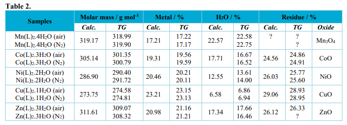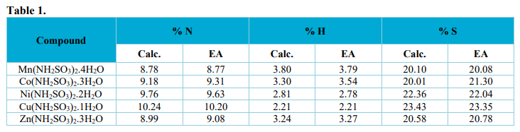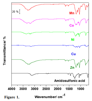 The elemental analysis results are presented in Tab. 1 and are in agreement with the proposed general formula M(NH2SO3)2.xH2O, where M = Mn2+, Co2+, Ni2+, Cu2+ and Zn2+ and x the number of water molecules ranging from 1 to 4, where x = 4 for Mn2+, 3 for Co2+ and Zn2+, 2 for Ni2+ and 1 for Cu2+.