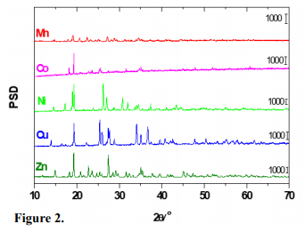 The X-ray diffractograms indicate that the compounds were obtained with a certain crystallinity degree, showing no evidence of isomorphism. The compounds showed relatively low intensity reflections.
