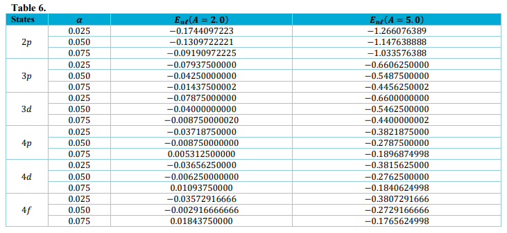 In this study, the energy eigenvalues for the energy-dependent screened Coulomb potential as they vary with the screening parameter were computed for different quantum states as shown in Tab. 1. The existence of the energy slope parameter in Eq. 26 results in two different energy spectra for a particular quantum state and a specific screening parameter. The screening parameter varies in an inverse version with the duo energy spectra. The energy eigenvalues for the energy-dependent screened Coulomb potential as a function of screening parameters in higher dimensions were also computed, as shown in Tabs. 2 and 3, respectively. By employing Eq. 30, we have also computed the energy eigenvalues in three dimensions and in the absence of the energy slope parameter, as shown in Tab. 4. For the two different potential depths considered, we obtained the bound state energy eigenvalues for different quantum states of 2p-4f , as they vary with different screening parameters. It can be seen that the energy eigenvalues for the different potential depths decrease as the screening parameter increases, at each quantum state. Our analytical result of Eq. 30 and its corresponding numerical results of Tab. 4 are very consistent with the results obtained by Dong et al.23. We have also computed the energy eigenvalues of Eq. 26 for higher dimensions, as shown in Tabs. 5 and 6, respectively. The level of effects imposed by the potential parameters of Eq. 2 on the energy eigenvalues of Eq. 26 are shown in Figs. 2-7. For different dimensions, the energy slope parameter causes an interwoven interaction of the curves, as compared to the situation when the energy slope parameter is zero. Figs. 8 and 9 show the variation of energy eigenvalues for the energy-dependent screened Coulomb potential with the different quantum numbers, for different values energy slope parameter considered. The trend of the relationship shows that the energy eigenvalues decrease as the quantum numbers increase. In Fig. 10, we also plotted the variation of the energy eigenvalues with the energy slope parameter for different dimensions.