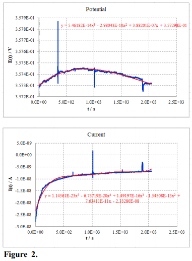 Considering that it is often necessary to remove the drift before analyzing the data7,8, this guide suggests a polynomial removal procedure. For this, graphs are constructed of potential or current against time, adding a trendline that provides the best fit to the data. This can be performed using the following commands: position the cursor on the graph and press the right button of the mouse → Add Trendline → Polynomial → choose the order that provides the best fit → mark Display Equation on chart → Close. Note that the polynomial orders for potential and current may be different each other. Format the graph and trendline, as desired. Fig. 2 shows examples.