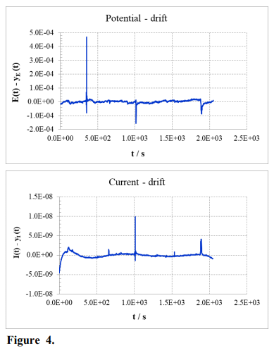 It is recommended to construct graphs of potential and current after removing the drift, in order to visualize the results and confirm that the values are near y = 0. Figure 4 shows an example.