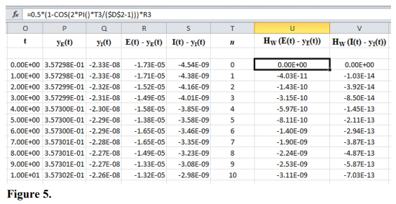 where N is the total number of points used (in this case, 2048) and n is the position of each experimental point, initiating at zero. This function must be multiplied by the values of E(t) - yE(t) and I(t) - yI(t), which are calculated as described above. Figure 5 shows the Data spreadsheet updated so far, where a column with numbers n was created (column T) to apply the Hann window (columns U and V) and the value of N (fixed, in this case given in cell D2). Note that to fix a cell, just click on it, and press the F4 key on the keyboard.