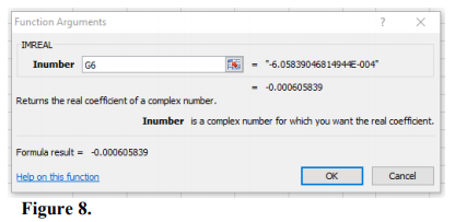 The result of the FFT is a complex number, so in order to perform the following calculations, it is necessary to separate the real and the imaginary parts into different columns. To do this, place the cursor on the next free column, aligned to the data (in the example, I6), and follow the commands for the real part: Formulas → Insert Function → IMREAL → click on the cell of the complex number (G6) and then on OK. The command window is shown in Fig. 8.