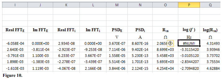 Copy the column “Power as MSA” of the tab FFTResultData1 (PSDE) and paste it in column E of the Sheet1 and repeat the proceeding for Current density (i), pasting the PSDI in column F of the Sheet1.