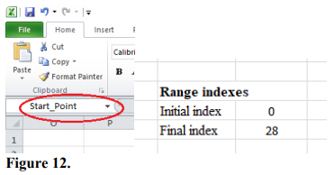 Position the cursor in a cell next to the bars (in the example, T16) and type a name for the cell in the identification space (upper left corner of the worksheet), for example, “Start_Point”, as shown in Fig. 12. Repeat the procedure in the cell below, naming it “End_Point”. On the left side of these cells, it is recommended to write the words “Initial index” and “Final index”, to indicate that the cells on the right show the positions (n) of the first and last points used in the linear fit. With this procedure, these cells have the function of variables for delimitation of the graph, using the slider.
