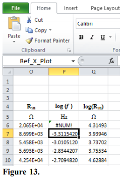 To calculate the slope and linear coefficients of the line obtained by the linear regression of log(Rsn) vs.log(f), it is necessary to calculate the logarithms (base 10) for these two columns. To do this, in the next two free columns (P and Q) do: =LOG10(F6) and =LOG10(O6), respectively, and drag to the entire columns. Note that as the first frequency value is f = 0, its logarithm cannot be calculated, so the expression “#NUM!” appears in cell P6. This is not a problem, as this point can be excluded during graph construction. Figure 10 shows the example in progress.