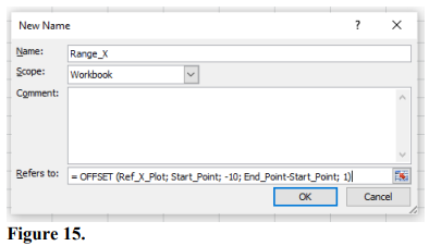 It is then necessary to declare the variables not linked to cells, in order to store the data range to be plotted. For this, the OFFSET function is used, so that they have a dynamic behavior, following the commands: Formulas → Name Manager → New. A name is then typed for the first variable. In this example, Range_X is suggested. Then type the expression: =OFFSET(Ref_X_Plot; Start_Point; -10; End_Point-Start_Point; 1) in the option “Refers to” in the box → OK. Figure 15 shows this procedure.