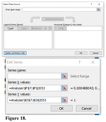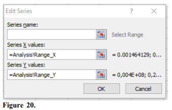 This command generates a clean graph area. Press the right mouse button on the area of that graph and select the option “Select Data”. In the dialog box that opens, select the option “Add” (Fig. 18) and a new dialog box (Edit Series) appears. In the “Series X values” option, select the frequency data (except f = 0), and in the “Series Y values” option, select the data for Rsn, except the value corresponding to f = 0. Click OK in both windows and the graph appears, with a linear scale. To change the scale of the graph to logarithmic, press the right mouse button on the scale of the axes → Format Axis → Logarithmic scale (Base 10). Do this for both axes.