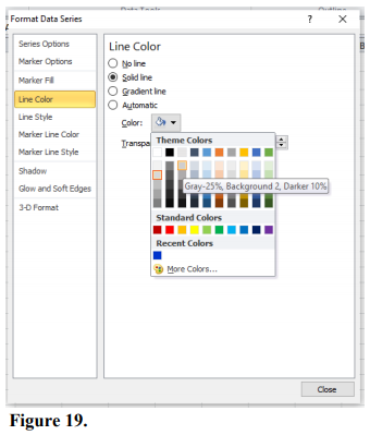 Change the color of the data to a light color, as it is overlaid by the region that is chosen for analysis. To do this, click on the graph with the right mouse button, select Format Data Series → Line Color → Solid Line, and choose a light color, as shown in Fig. 19. Also format the window type, line thickness, axis scale, font, etc., as desired by the user.