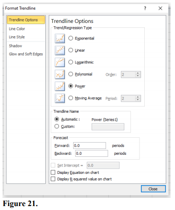 For the purposes of this work, it is necessary to add a trendline, which is used to perform the linear fit of the experimental data to a mathematical function (linear regression), using the least squares method. To do this linear regression, click with the right mouse button on the new data sequence (the darkest graph) and choose the option “Add Trendline”. Click on “Power”, as shown in Fig. 21, since the graph axes are on a logarithmic scale and the logarithm properties transform powers into products, so the result is a line. Change the properties “Line Color” and “Line Style”, as desired.