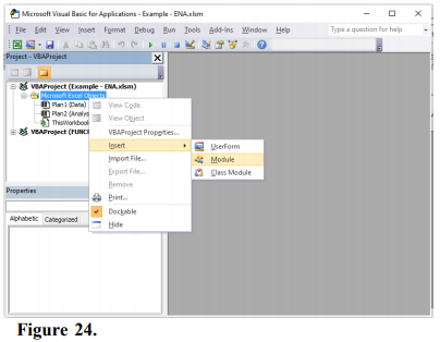 On the ribbon, click Developer → Visual Basic. In the window that appears in the left part of the screen, right-click on Microsoft Excel Objects → Insert → Module, as shown in Fig. 24.