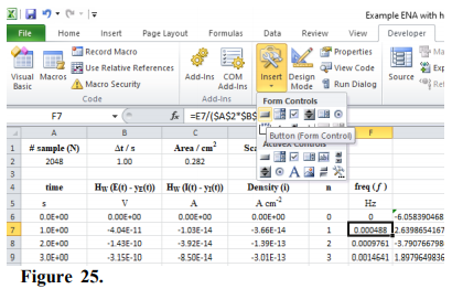 Return to the Analysis spreadsheet and choose the location where it is desired to place a button that is to be clicked to update the FFT calculations when a new data set is introduced. In the Developer tab, click on Insert and then click on the image of a button, as shown in Fig. 25.