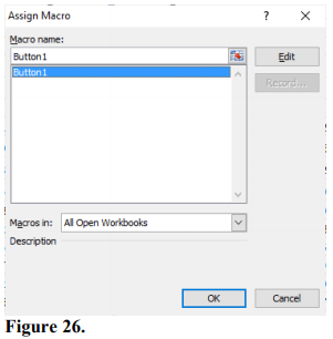 Next, click where it is desired to create the button, dragging the cursor to form a rectangle. Release the mouse when the desired size is reached. At this point, a window called Assign Macro opens. Click on Button 1 and then OK (Fig. 26).