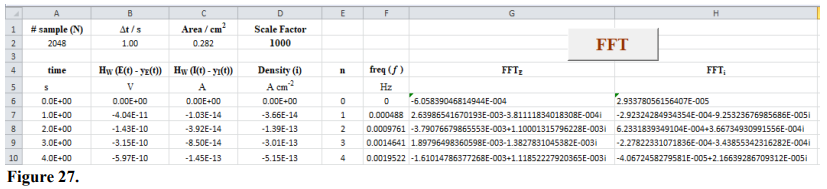 where 𝑓𝑚 = 𝑚𝛥𝑓 is the frequency related to the m-th sampling point and x is the function to be transformed (in this case, the potential E and the current density i). The FFT is an algorithm that optimizes the calculations by making them faster, compared to the discrete Fourier transform, and for its use the data set should contain a number of points equal to a power of 2 (for example, 2048= 211). In Excel, this algorithm is implemented using the “Fourier Analysis” function.
