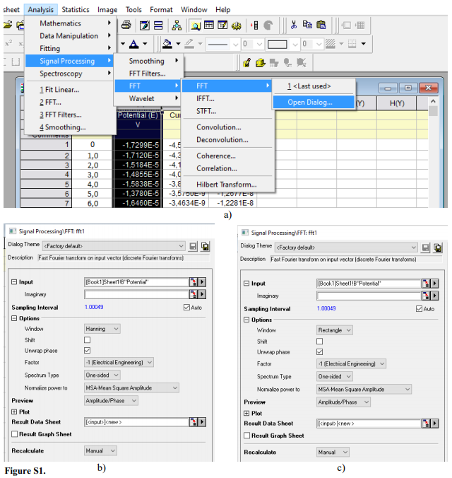 Select the potential column and follows the commands: Analysis → Signal Processing → FFT → FFT → Open Dialog (Fig. S1a). In the window that appears, choose the option Window Hanning → uncheck Shift → in Spectrum Type box, choose One-sided → uncheck Result Graph Sheet → Ok (Fig. S1b). If you do not use the Hann window, mark Window Rectangle, as in Fig. S1c: