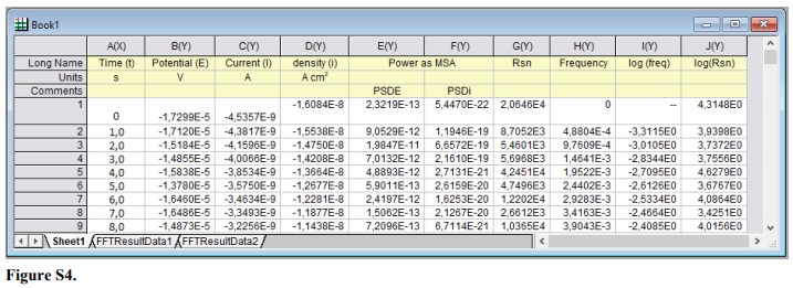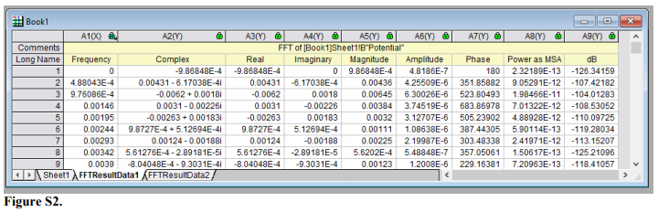 A new tab is created (FFTResultData1) that has all necessary information to potential analysis, including frequency and PSDE, which is in column of “Power as MSA”. Repeat the proceeding for the column of the current. The Fig. S2 shows the tab FFTResultData1.