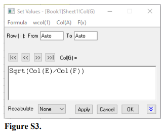 Select the column G in the Sheet1 and follow the commands: Column → Set Columns Values → in the box, type Sqrt(Col(E)/Col(F)) → Ok, to calculate Rsn. Figure S3 shows this proceeding.