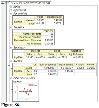 Fit the straight line to graph (linear regression) by commands: Analysis → Fitting → Linear Fit → Ok. A new tab will be open, and the values of slope and intercept are presented in Parameters, like in the Fig. S6. Use these parameters to calculate R0sn, as described in the paper.