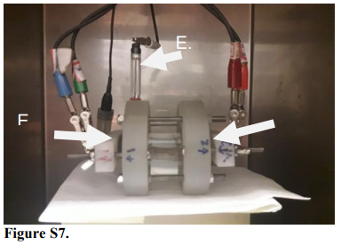 The electrochemical cell (Fig. S7) consisted of a glass cylinder placed horizontally, having two similar CPE electrodes fixed to the opposite sides of the cylinder and a reference electrode of Ag/AgCl/KCl3mol L-1 in a Lugging capillary positioned close to one of the CPE electrodes. Once the electrochemical cell was connected to the potentiostat, all current and potential filters were activated for automatic scaling. The electrochemical cell was switched on and the potential and current noise were expected to stabilize before starting to record the 2048 points at the frequencies of 1 Hz. The experiments last 34 min and 8 s (1 Hz). Experimental data are in Excel in Supplementary information 2.
