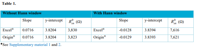 The procedure presented above was also performed without Hann window. The results obtained with Excel were compared with those obtained with Origin® (see the Supplementary Information 1), a software package widely used by chemists, using the same experimental data and the same linear regression frequency region. The results are presented in Tab. 1.