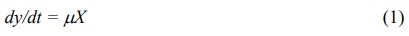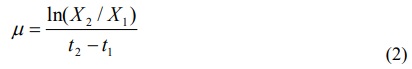Integrating and re-arranging Eq. 1, the growth coefficient also called specific growth rate (μ, d-1) can be calculated using the Eq. 2: