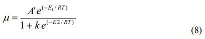 The effect of the temperature on the maximum specific growth rate is based on Arrhenius model (1889), which implies an exponential increase in growth rate of the cells with rising the temperature. However, it is well recognized that the Arrhenius model fails once the temperature approaches the value of optimum activity, because it cannot represent the decline in rates at higher temperatures. Due to this limitation, alternative models have been proposed, which can predict the decline in rate following the optimum. Mayo model (Eq. 8) modified the Arrhenius equation based on the premise that the active fraction of the enzymes involved in the growth limiting reaction deceases when the temperature exceeds the optimum, this expression is also able to predict a decline in the maximum specific growth rate when the temperature exceeds the optimum15.