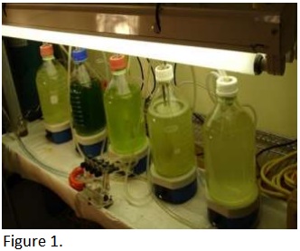 The photobioreactors temperature was maintained constant by immersing the photobioreactors in acrylic open water baths (0.46 x 0.25 x 0.8 m) with immersion circulator analog controller (Isotemp 2100). The light intensity was generated by cool white fluorescent tubes (General Electric 40w to 80w) and measured using a quantum sensor (model LI-190SA), connected to a quantum/radiometer/photometer light meter (model LI-250A, Li Cor Inc. Lincon, NE, USA). The quantum sensor was configured to make measurements of photon flux density (PDF) in the PAR (Photosynthetic Active Radiation, 400-700 nm). The source of CO2 was provided by Airgas Specialty Gases New Jersey, 200 and 300 cubic feet volume cylinders of CO2 concentrations of 0.5, 2.5, 5.0, 7.5 and 10% balance with air, the concentrations certified by the vendor.