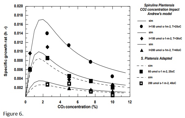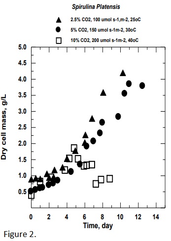 In this study, the maximum mean CO2 biofixation rate recorded for S. platensis was 25.1 gCO2 m-3 h-1 cultivated at 2.5% CO2, 150 µmol m-2 s-1 and 25 °C, corresponding values for S. platensis adapted being 18.2 gCO2 m-3 h-1 for 2.5% CO2, 60 µmol m-2 s-1 and 25 °C.