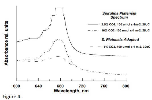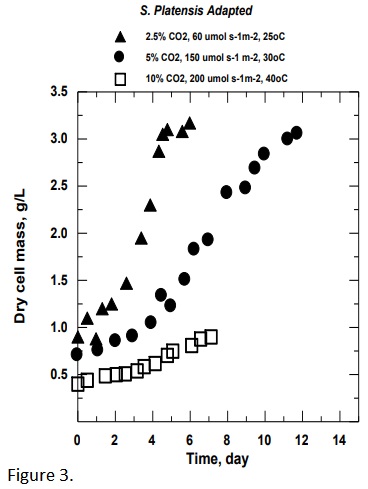 Waste stream flue gases emitted from stationary sources such as power plants, industrial boilers, refineries and others, using fossil fuels for combustion and energy production produce from 4 -14% CO2 and air in a closed space such as a space station or a submarine < 1% CO22. It has been reported that microalgae present one of the few technologies for the capture and utilization of CO217. The results indicate that both S. platensis and S. platensis adapted to high salt concentration can be used for CO2 biofixation of flue gas emitted from stationary sources. In fact, maximum daily evaluation of the efficiency CO2 removal by S. platensis during experiments up to ten days, achieved 92% at 0.5% CO2, 99% at 2.5% CO2, 84% at 5% CO2, 89% at 7.5% and 88% at 10% CO2, respectively. Corresponding values for S. platensis adapted being 96% at 2.5% CO2, 90% at 5% CO2, 78% at 7.5% CO2 and 73% at 10% CO2, respectively (See Appendix).