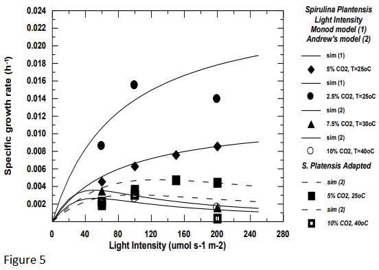 The relationship between the µ value and environmental cultivation parameters such as CO2 concentration, temperature and light intensity in terms of experimental kinetic models (Monöd, Andrews and Mayo) and the impact of salinity is illustrated for S. platensis (Tab. 3) and S. platensis adapted (Tab. 4), respectively. The impact of light intensity on μ of S. platensis, in principle is described by Mönod well in the range of 60 to 150 µmol m-2 s-1Eqs. 9 and 10 (Tab. 4). The maximum specific growth (µmax) estimated (0.44 d-1) is depleted as CO2 concentration and temperature were increased. Under these conditions, µmax decreased to 0.22 d-1 and Andrew’s model described better the kinetics of S. platensis exposed to higher light intensity (Eqs. 11, 12 in Table 4 and Fig. 5). In fact, a decline in the photosynthetic activity was observed after four days of experiment run under 10% CO2, 200 µmol m-2 s-1, and 40 °C, suggesting these values as potential limiting factors of microalgae growth and photoinhibition10. The influence of light intensity on the kinetics of S. platensis adapted was stronger than the impact on the µ of pure culture S. platensis (see Tab. 5: Eqs. 19, 20 and Fig. 5), Andrew’s model described this impact, µmax dropped from 0.31 d-1 for 5% CO2 and 25 °C to 0.22 d-1 for light intensities higher than 150 µmol m-2 s-1and photoinhibition occurred when CO2 and temperature increase to 10% and 40 °C, suggesting that in addition to light intensity salt stress affect its photosynthetic activity and may inhibit completely at 10% CO2 and 40 °C. These results agree with Zeng et al.10, who reported that the effect of salinity stress was stronger when cells of S. platensis were grown under higher light intensity 200 µmol m-2 s-1 and showed lower capacity of recovery in the photosynthetic activity after photoinhibition than lower light intensity (100 µmol m-2 s-1) grown cells. This was attributed as a result of the fact that stressed cells have lower protein synthesis capacity and thus a slower repair mechanism.