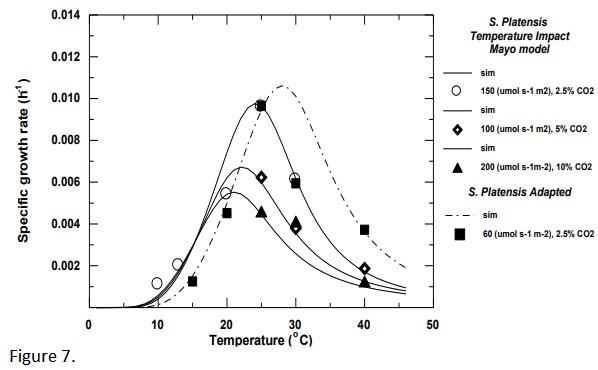 Empirical microbial growth kinetic models were explored to describe the impact of environmental factors on specific microbial growth of S. platensis and S. platensis adapted. Mönod model (Eq. 6).