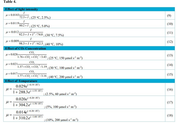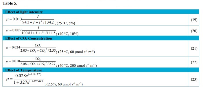 where Ks is the Mönod kinetic constant and S-, CO2 concentration or light intensity. When the substrate inhibits microbial growth at high concentrations, an optimum at which the highest specific growth rate occurs in this case, the Mönod model can be modified by Andrews model (Eq. 7).