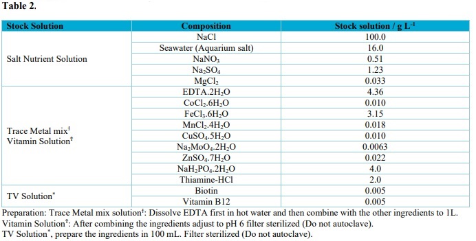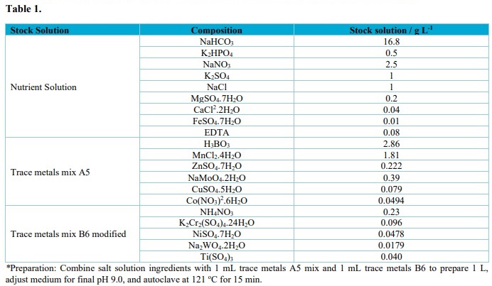 Adaptation of S.platensis to high salinity, an inoculum of microalgae S. platensis were cultivated in a modified Zarrouk’s medium10 (Tab. 2).