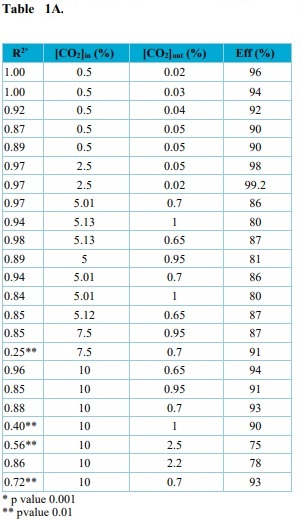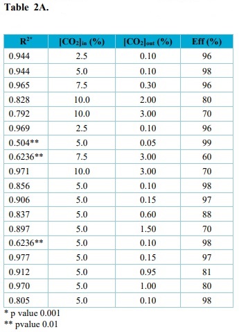The efficiency of CO2 removal was calculated as follows: 100*(CO2)input.- (CO2)output/(CO2)input , where CO2input is the initial and (CO2)output the stream gas off the bioreactor4.