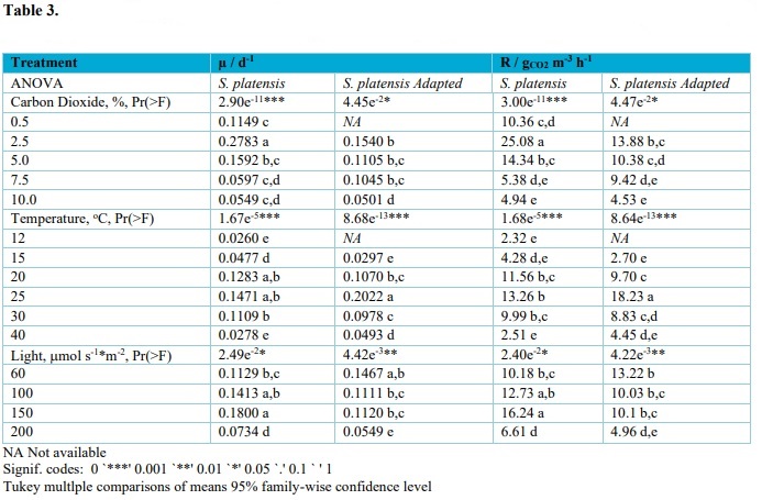 Conversely, the μ and R values of S. platensis adapted, increased as the cells were exposed to lower light intensity from 60 µmol s-1 m-2 (0.15 d-1, 13.2 gCO2 m-3 h-1) to 200 µmol s-1 m-2 (0.05 d-1, 4. 96 gCO2 m-3 h-1). But there were no significant differences between μ and R values of S. platensis adapted cultivated with 60 and 100 µmol s-1 m-2, respectively, indicating that S. platensis adapted to salinity stress is less tolerant to growth at elevated light intensity and temperature, suggesting a decrease in photosynthetic activity of S. platensis adapted (Tab. 2).