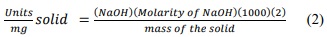 The enzymatic hydrolytic activity of stannosilicate-enzymes complexes was determined by titrimetric method35,53 and following ACS specifications in the sigma standard enzymatic assays for lipases (triacylglycerol acylhydrolases, E.C.3.1.1.3). Since that, the enzymatic activity is obtained by a hydrolysis reaction, one unit of lipase activity was defined as the amount stannosilicate-enzymes complexes releasing one mole of FFAs from a triacylglyceride source in 1 h of reaction at 40 ± 2 °C, expressed by the unity of U mg–1 (unit of lipase activity/mg of stannosilicate-enzymes complexes). In a typical measurement, 10 mL of a mixture containing 20 mmol L–1 at pH 7 of phosphate buffer and a triacylglyceride substrate (refined soybean oil, Glycine max) was prepared in the volume proportion of 1:1.