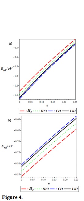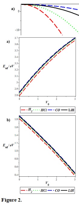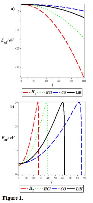The variation of the energy eigenvalues with different parameters of the combined potential, such as V0, V1, a, b, c and q, is shown in Figs. 1–7, respectively, for H2, HCl, CO and LiH diatomic molecule in the ground state. In Fig. 1a and b, the variation of the energy spectrum was plotted for various values of n as a function of the parameter ℓ for q = 1 and q = –1, respectively. Figure 1a shows that the energy decreases as the angular momentum increases. In Fig. 1b, it is possible to observe that the energy increases as the ℓ increases up to a maximum and then drops again sporadically. Figure 2a and b shows the variation of the energy spectrum for various values of n as a function of the parameter V0 for q = 1 and q = –1, respectively, in the region 0 < V0 < 3. In Fig. 2a, the energy of the system increases as the parameter V0 increases. In Fig. 2b, the energy linearly decreases as V0 increases. Figure 3a and b shows the variation of the energy spectrum for various values of n as a function of the parameter V1 for q = 1 and q = –1, respectively, in the region 0 < V1 < 0.16. In both figures, the energy increases monotonically as the parameter V1 increases as well. Figure 4a and b shows the variation of the energy spectrum for various values of diatomic molecules as a function of the parameter a, respectively, in the interval 0 < a < 0.25. In both cases considered, the energy increases linearly with increasing a, but in the case q = –1 (Fig. 4b), there is a wider spacing between the energy levels. Figure 5a and b shows the variation of the energy spectrum for various values of n as a function of the parameter b for q = 1 and q = –1, respectively, in the region 0 < b < 1. In Fig. 5a, the energy increases linearly as the parameter b increases. In Fig. 5b, the energy decreases linearly as the parameter b increases. Figure 6a and b shows the variation of the energy spectrum for various values of n as a function of the parameter c for q = 1 and q = –1, respectively, in the region 0 < c < 0.20. In Fig. 6a, the energy decreases linearly as the parameter c increases. In Fig. 6b, the energy decreases linearly as the parameter c increases. Figure 7a and b shows the variation of the energy spectrum for various values of n as a function of the parameter –q and +q in the intervals –1 < q < 0 and 0 < q < 1, respectively. In Fig. 7a, the energy increases up to a maximum as q increases and then declines again. In Fig. 7b, the energy increases linearly as q upsurges.