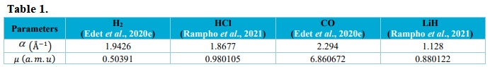 In the present study, the energy spectrum was used to study the four selected diatomic molecules, H2, HCl, CO and LiH. The spectroscopic parameters of these molecules are given in Tab. 1 and taken from (Edet et al., 2020e; Rampho et al., 2021). The following conversions were used; ℏc = 1973.269eVÅ and 1amu = 931.5 × 106 eV(Å)-1 for all computations (Edet et al., 2020e; Rampho et al., 2021). All non-spectroscopic parameters are kept in natural units.
