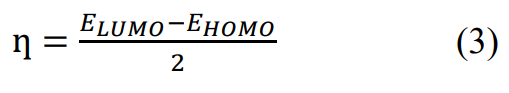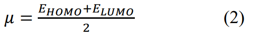 The electronegativity (Eq. 1) is opposite of the chemical electronic potential μ (Eq. 2), the latter and the global hardness (Eq. 3) are calculated from the energies of the molecular orbital boundaries according to the following relationships (Khalid et al., 2020; Parr and Pearson, 1983; Zhou and Parr, 1989):