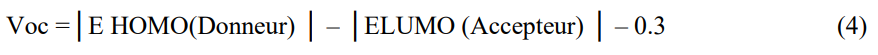 The theoretical values of the open circuit voltage, Voc, have been calculated from the following expression (Eq. 4 and Eq. 5) (Boussaidi et al., 2016; Bourass et al., 2017):