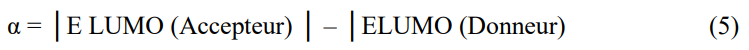 [Eq. 5]The energy values of LUMO (eV), HOMO (eV), E gap (eV) and the open circuit voltage Voc (eV) and α (eV) of the studied molecules are presented in Tab. 5.