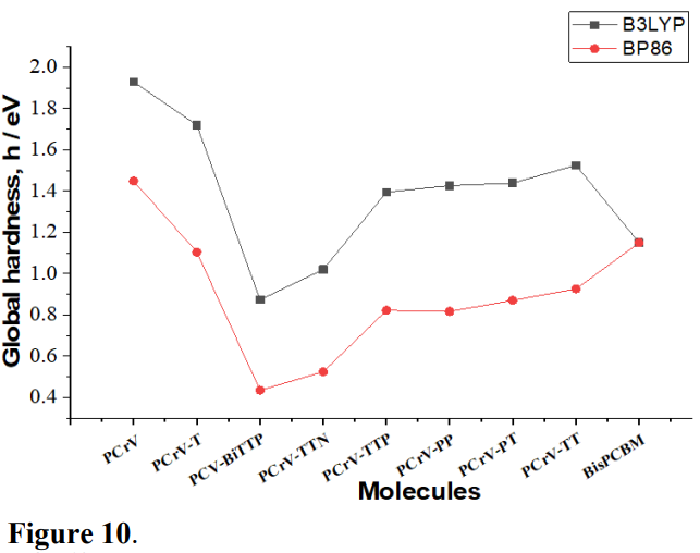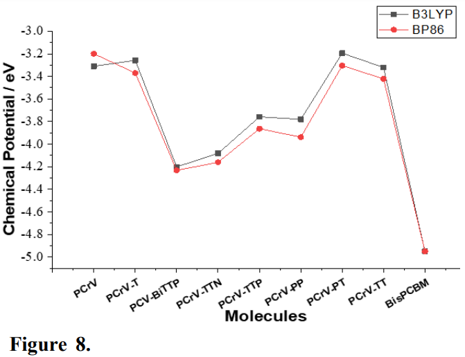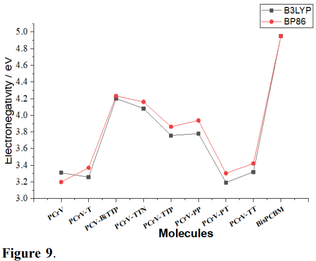 Comparing the different values of electronegativity shown in Fig. 9, it can be noticed that Bis-PCBM is the molecule with the highest value of electronegativity (Tabs. 2 and 3). Therefore, the molecule with the highest electronegativity value is likely to attract electrons strongly. Here, Bis-PCBM is the electron accepting molecule.