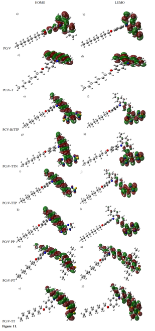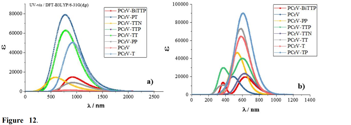 From the absorption spectra (Fig. 12b), the electronic transitions of the double spectral band for all molecules belong to the visible field and in particular for the oligomers PCrV-BiTTP, PCrV-TTP. That is to say, the low energy radiation can excite the electrons of the system.