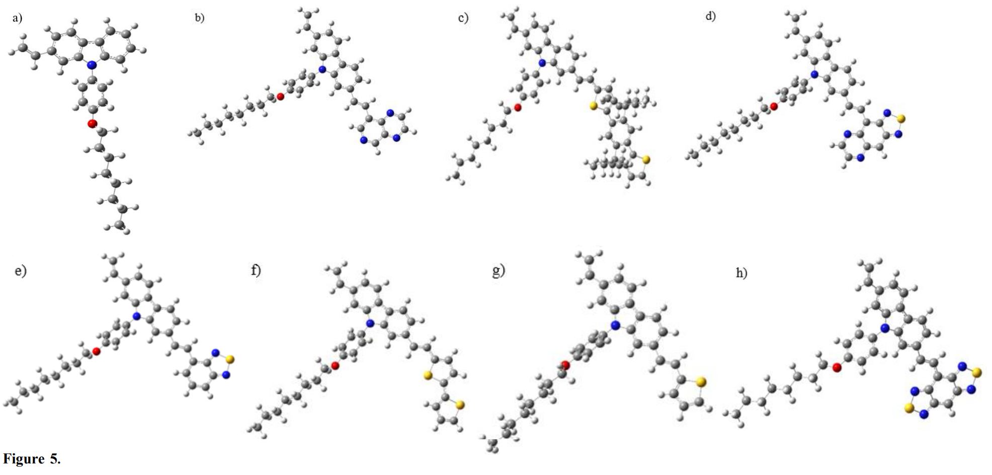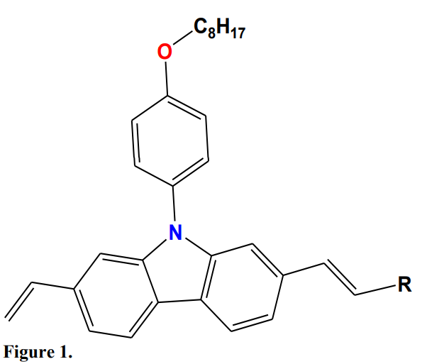 The basic molecule 9-(4-octyloxyphenyl)-2.7-divinylcabazole was chosen, to which was linked a radical R, which was changed to obtain the different systems studied. The different R groups were introduced to study their effects on the electronic structure and on the optoelectronic properties. Below are the structures of the R groups and the abbreviation of different oligomers (Fig. 2).